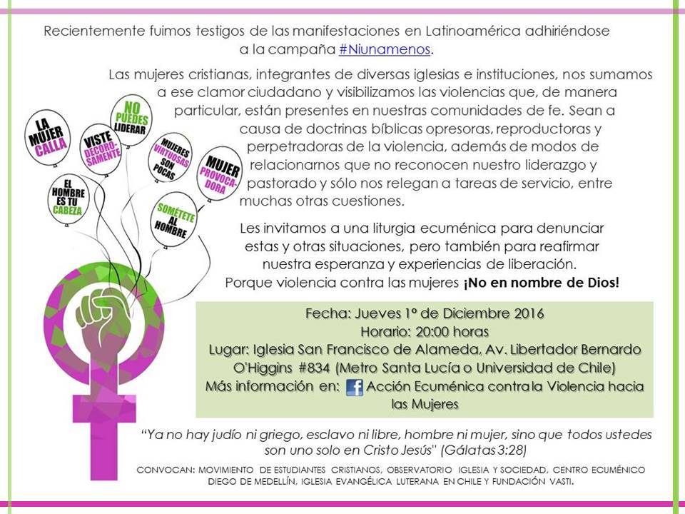 “Reciéntemente fuimos testigos de las manifestaciones en Latinoamérica adhiriéndose a la campaña #NiUnaMenos (…). Les invitamos a una liturgia ecuménica para denunciar estas y otras situaciones (…)”.