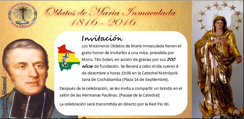 La Congregación de los Oblatos de María Inmaculada, invita a celebrar los 200 años de fundación el 8 de diciembre, participando de la misa presidida por Mons. Tito Solari, en horas 19:00 en la Catedral Metropolitana San Sebastián de Cochabamba.