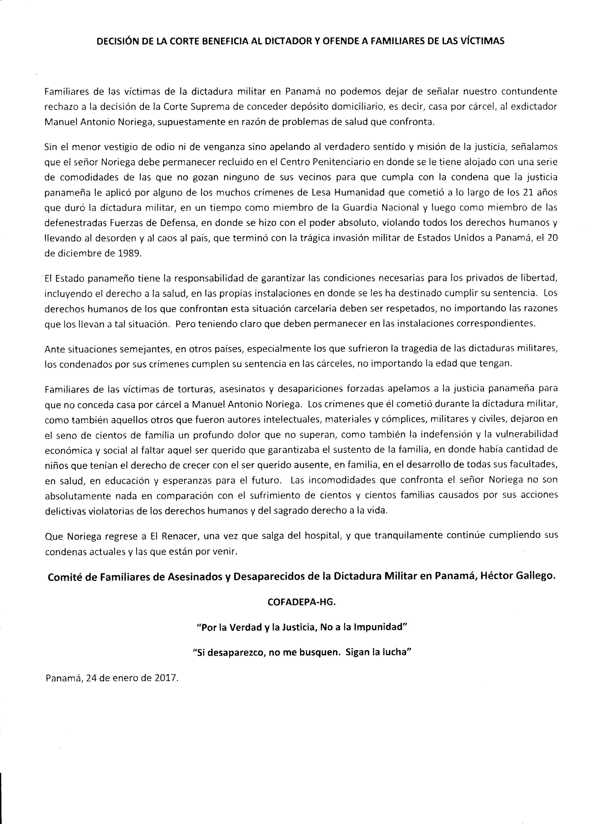 “Familiares de las víctimas de la dictadura militar en Panamá no podemos dejar de señalar nuestro contundente rechazo a la decisión de la Corte Suprema de conceder depósito domiciliario, es decir, casa por cárcel, al exdictador Manuel Antonio Noriega, supestamente en razón de problemas de salud que afronta (...)”.