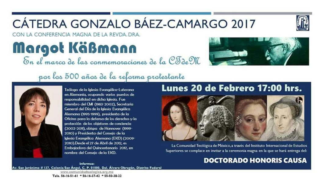 La comunidad teológica de México, a través del Instituto Internacional de Estudios Superiores se complace en invitar a la ceremonia magna en la que se hará entrega del Doctorado Honoris Causa a la Rvda. Dra. Margot KäBmann