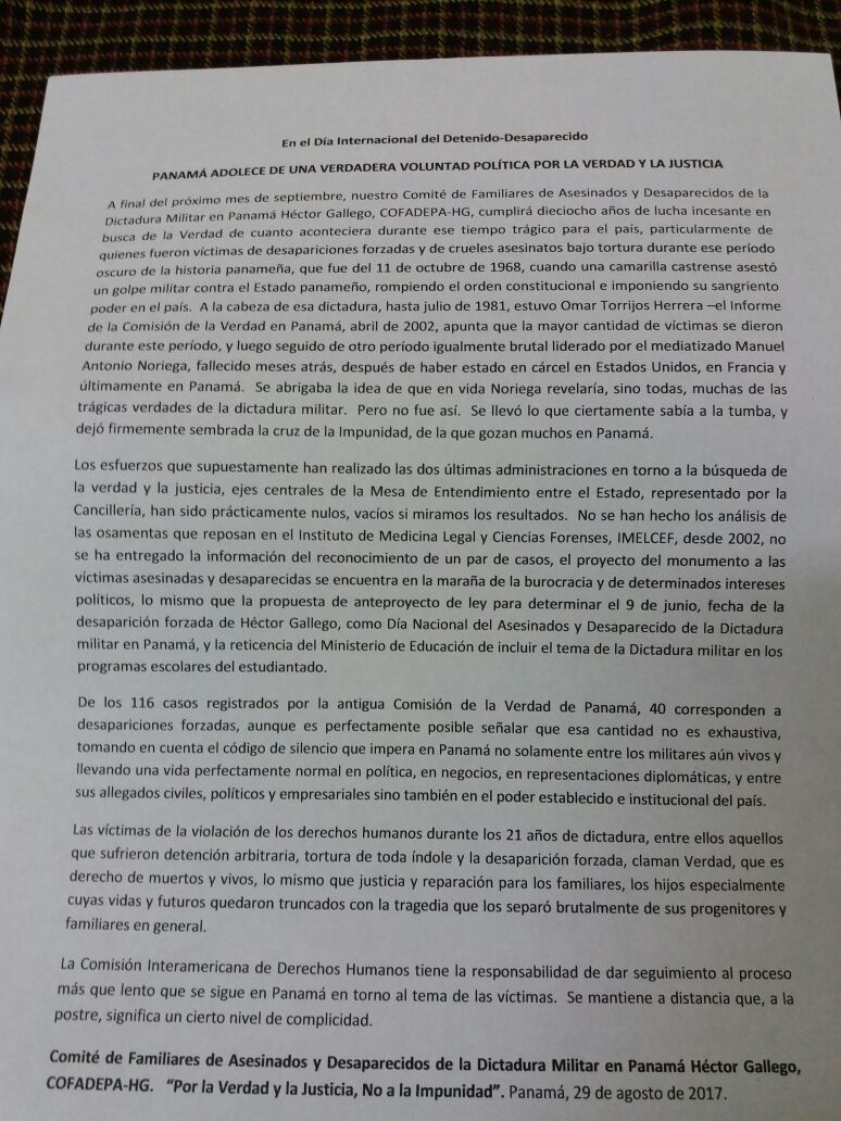 “Panamá adolce de una verdadera voluntad política por la verdad y la justicia”, se lee en el comunicado del Comité de Familiares de Asesinados y Desaparecidos de la Dictadura Militar en Panamá Héctor Gallego (COFADEPA-HG)…