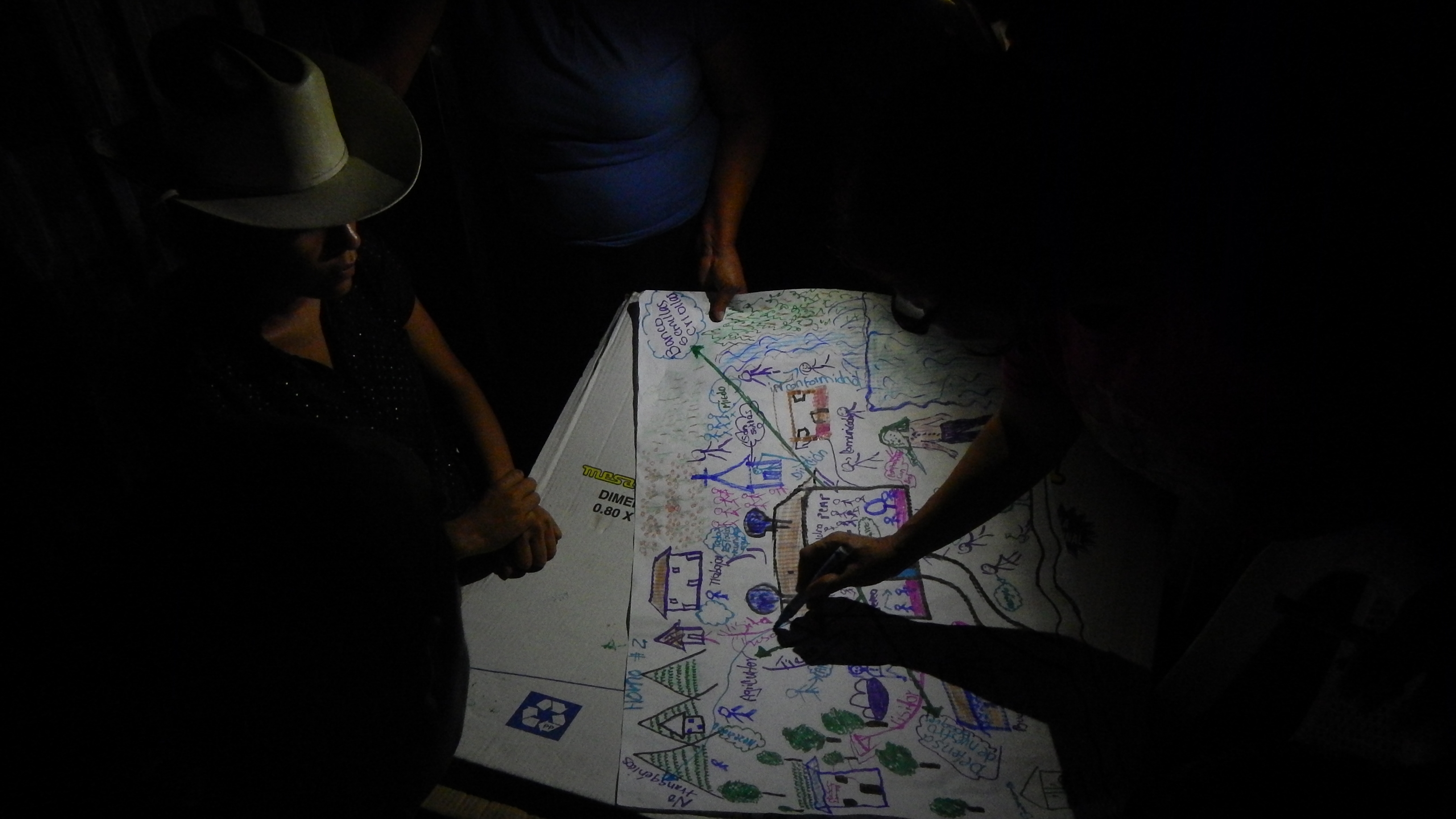 En Matagalpa las cartografías fueron hechas en penumbras. En medio de la falta de luz, un hombre de unos 50 años intenta lanzar los trazos fundamentales de su comunidad. Le cuesta, le da vuelta, se desanima, descansa y luego continúa. Cuando esta por desertar de la misión, llegan su hija y sus nietos, miembros de la comunidad también. Y allí sí, con la fuerza que solo las CEB intergeneracionales tienen, comenzó la construcción de una cartografía que vio la luz y que reflejó la vida hermosa de la comunidad ‘El Mamonal’.