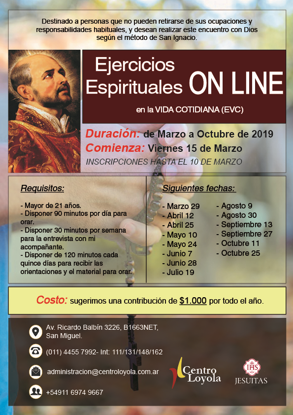 Destinado a personas que no pueden retirarse de sus ocupaciones y responsabilidades habituales, y desean realizar este encuentro con Dios según el método de San Ignacio…