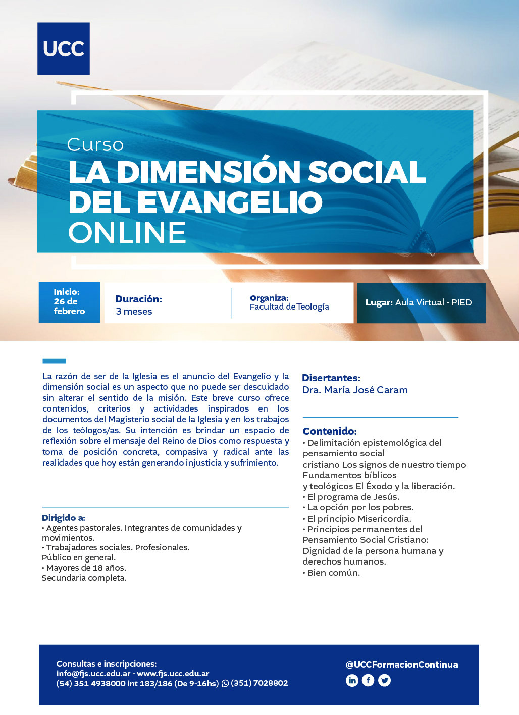 La facultad de teología de la Universidad Católica de Córdoba invita al curso on-line “La dimensión social del Evangelio”, que contará con las disertaciones de la Dra. María José Caram…