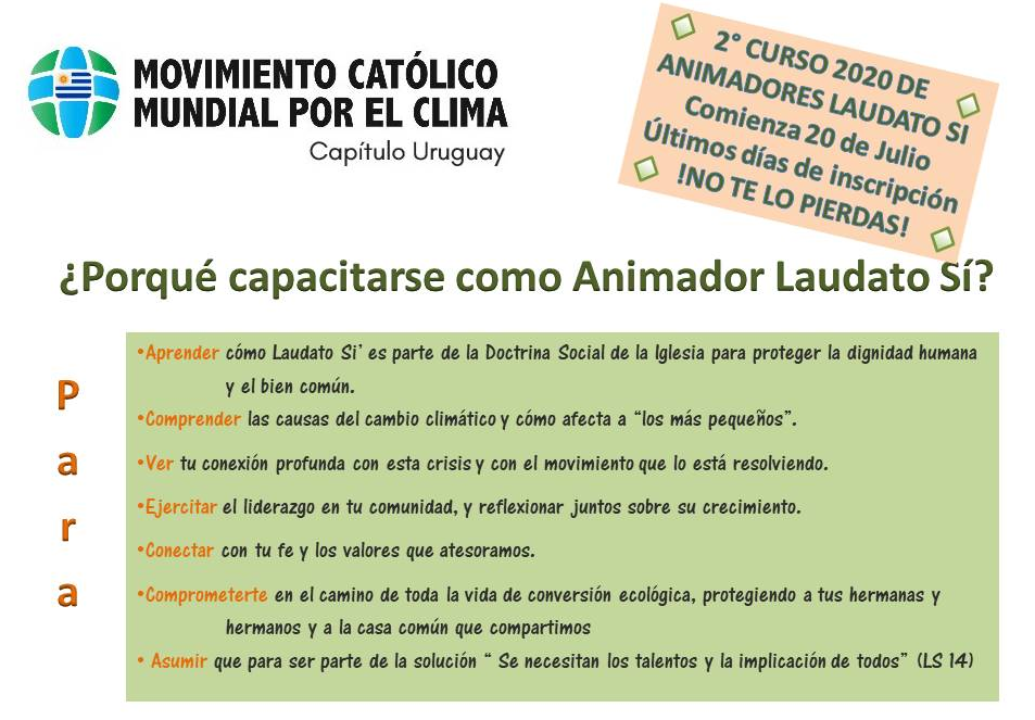 El Movimiento Católico Mundial por el Clima, Capítulo Uruguay, invita al 2º Curso 2020 de Animadores Laudato Si…