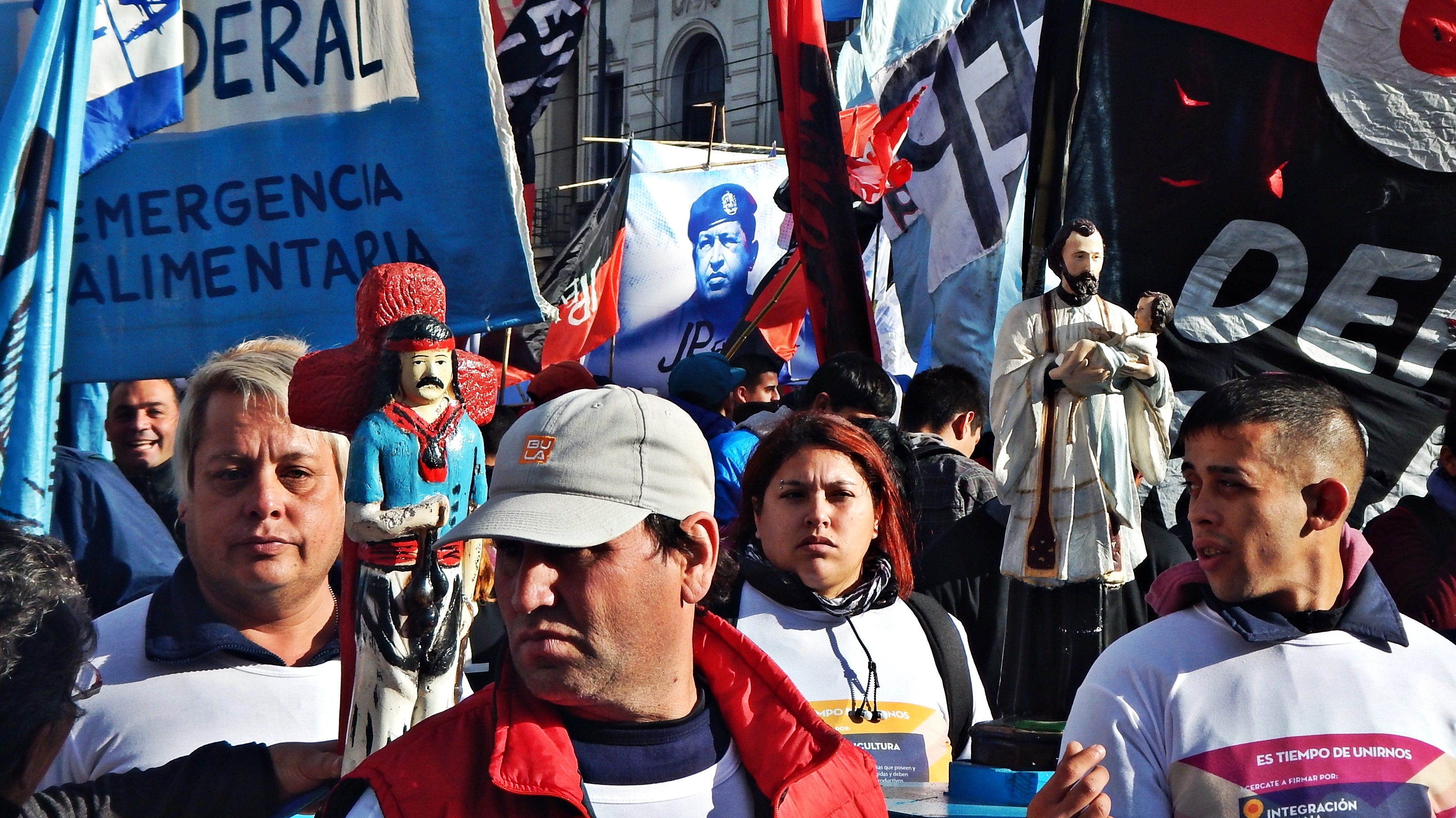 2016, doscientas mil personas se paran frente al despojo Macrista, frente a la miseria planificada, frente al abismo. Lxs que se paran, tienen memoria: hace 40 años la herida del golpe militar, hace 20 la traición con patillas, hace 15 el robo del siglo, el ‘que se vayan todos’. La memoria esta la piel y camina de San Cayetano hasta plaza de Mayo. Desaparecidos, abuelas, piqueteros, desocupadxs inventores, creyentes combativos, hormigas en bicicletas, hermanos en puentes y estaciones. Todxs están en esa plaza: ‘El pueblo no separa la fe de la lucha, porque no separa la fe de la vida’, grita el principal orador, y el Santito descamisado, le guiña el ojo, o lo aplaude, o sonríe. No lo sabemos, porque es imposible identificarlo, se ha perdido en la multitud, se ha hecho todo en todos ellos.