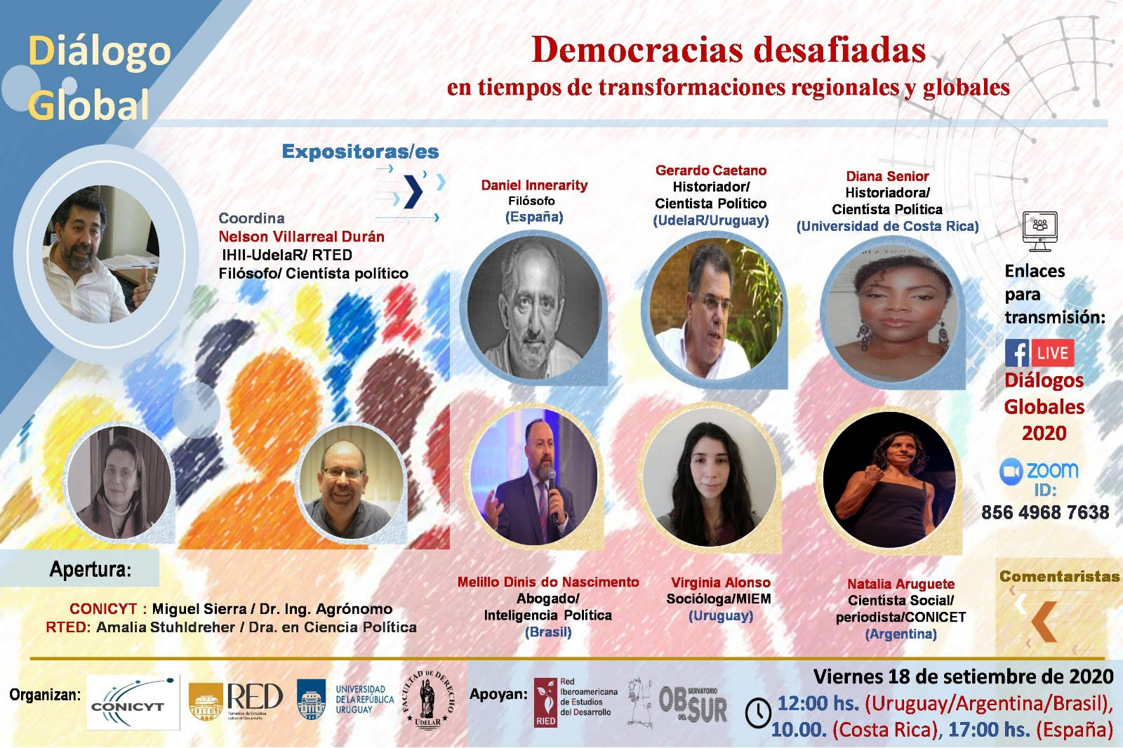 Bajo la moderación de Nelson Villarreal Durán, varias organizaciones como RTED, Conicyt, ObSur, la Universidad de la República de Uruguay y la Red Iberoamericana de Estudios del Desarrollo invitan al diálogo global: “democracias desafiadas en tiempos de transformaciones regionales y globales” ...