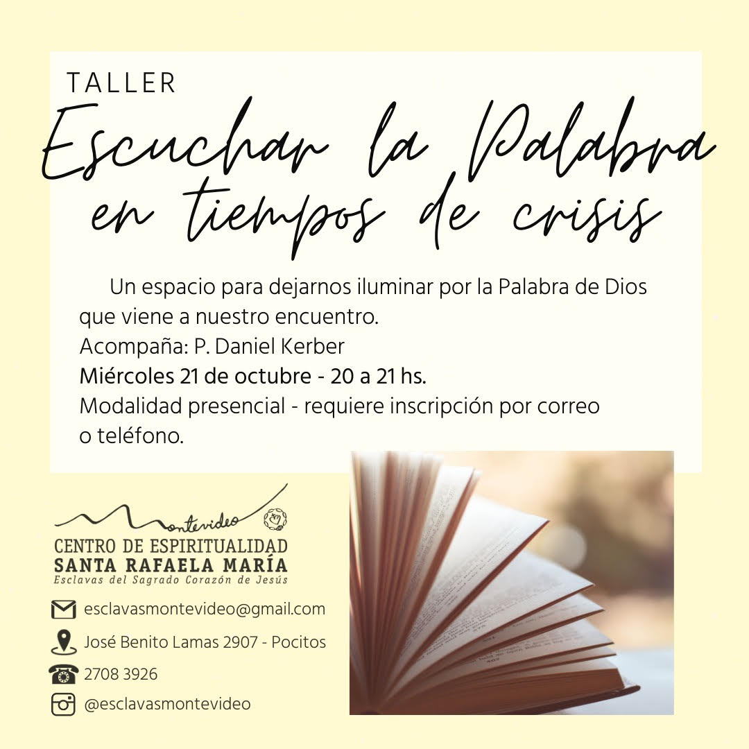 El Centro de Espiritualidad Santa Rafaela María de Uruguay invita al Taller “Escuchar la Palabra en Tiempos de Crisis” el próximo 21 de octubre, con la participación del P. Daniel Kerber…