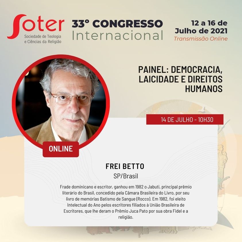 No dia 14 de Julho o 33º Congresso Internacional da SOTER realizará o painel “Democracia, laicidade e direitos humanos”, com a participação de Frei Betto…