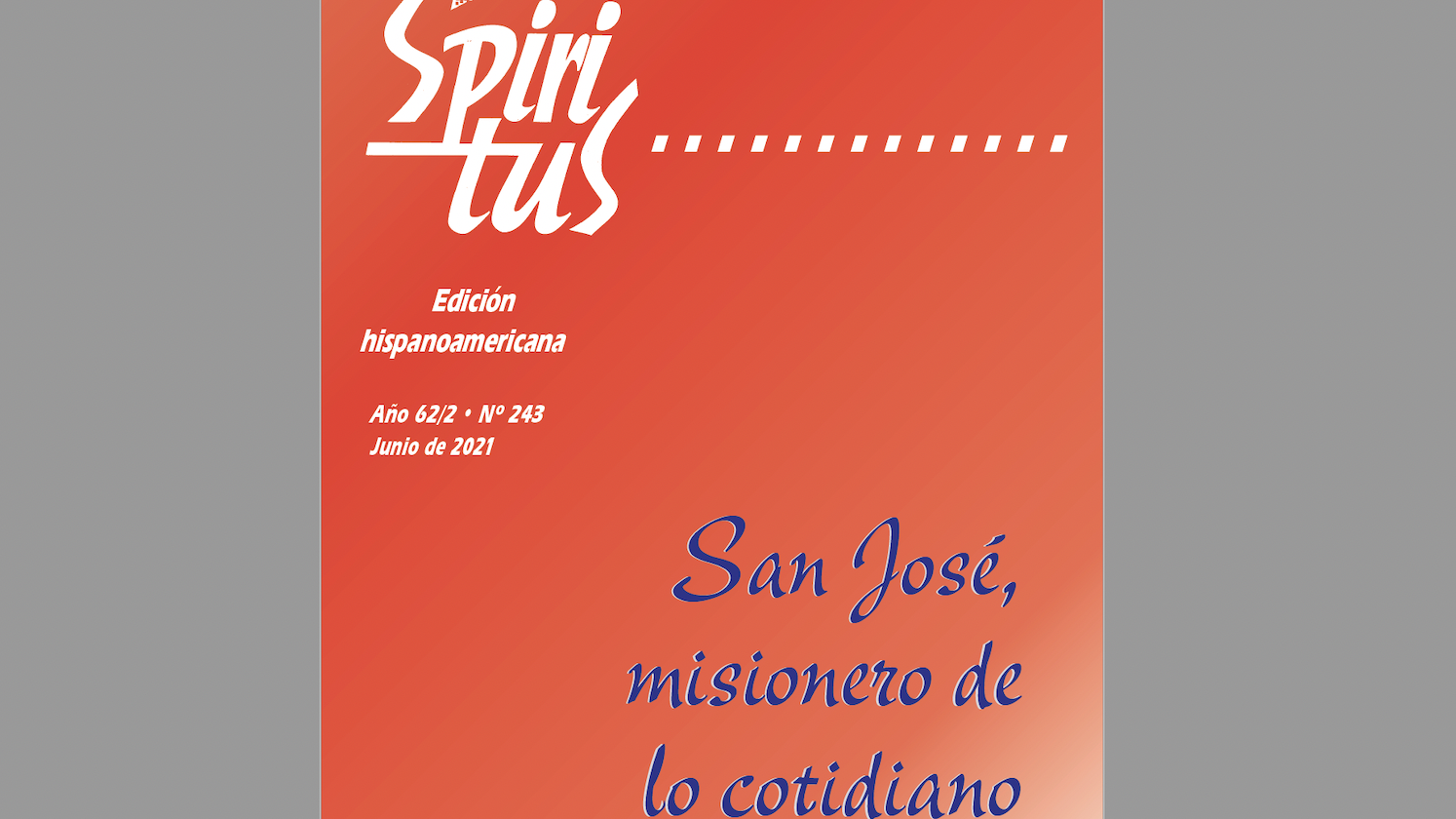 A su vez, este número 243 de Spiritus quiere participar en esta conmemoración del “santo patrono de la Iglesia, el padre adoptivo de aquellas y aquellos que están ocultos en ‘segunda fila’ y que, sin embargo, es un ‘papel incomparable’ en la misión. Ellos nos invitan, discretamente, a dar “manos y corazón” al Evangelio…