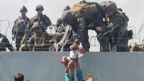 Ese niño que vemos colgando entre manos no es sólo un niño, sino que es el mundo de mañana. En su llanto resuena el grito del mundo que se desgarra ante la tragedia de Afganistán y tantas otras en las que nos va la vida a todos nosotros. La foto es impresionante por su simetría. Abajo un muro, el caos y el terror. Arriba un cielo nublado envuelve la resignación, la impotencia y la estupefacción. Los brazos de un padre y una madre alzan al cielo el bebé. Es muy pequeño, su cuerpo se arquea, no tiene aún fuerza para sostenerse por sí mismo. Ese manojo de brazos es también simétrico al brazo que lo recibe y sujeta en el aire. El niño ya está en un país seguro, pero pareciera que esta brutal reconquista talibán que echa su negra sombra sobre todo el país dejara esta foto quieta para siempre, con el niño colgando entre dos mundos. Esas dos partes de la foto no están quietas ni ya unidas, sino separándose cada vez más, alejándose. Los de abajo son un buque que se hunde en la oscuridad del talibanismo sin que podamos salvar a la inmensa mayoría de náufragos…