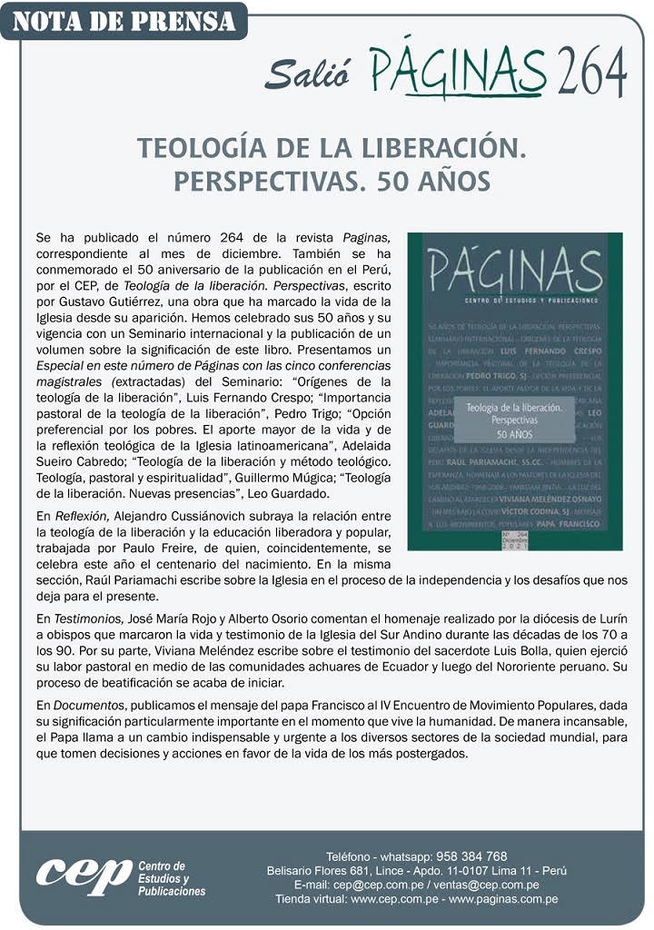 Se ha publicado el número 264 de la revista Páginas, correspondiente al mes de diciembre. También se ha conmemorado el 50 aniversario de la publicación en el Perú, por el CEP, de Teología de la liberación. Perspectivas, escrito por Gustavo Gutiérrez…