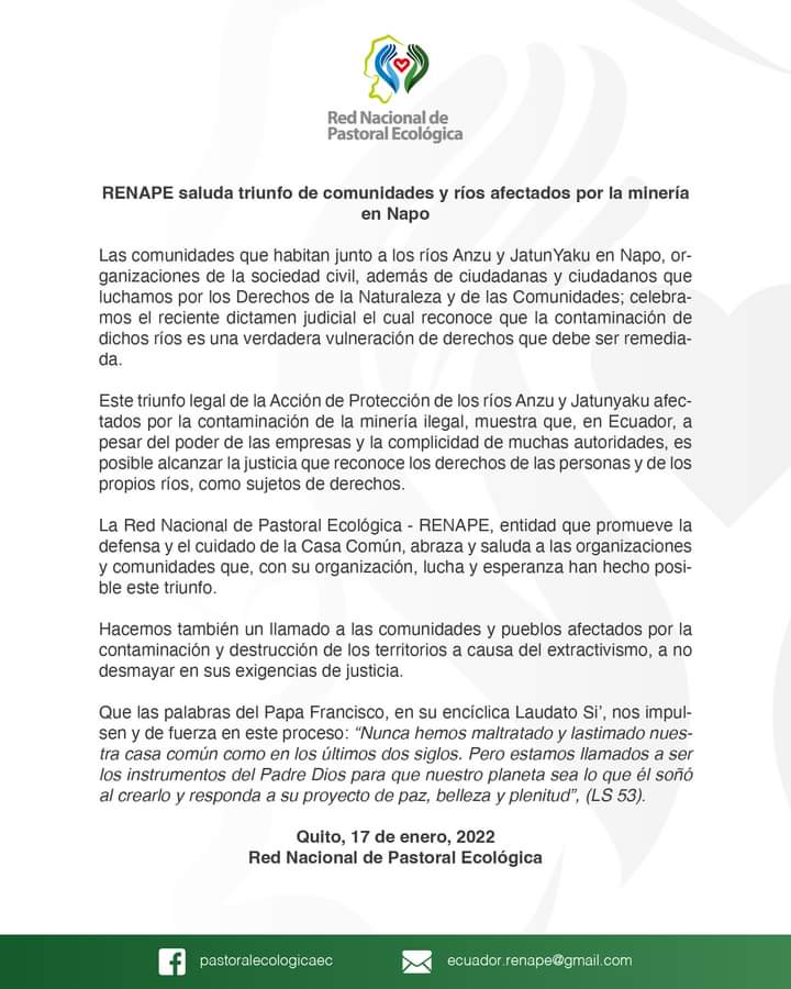 Las comunidades que habitan a los ríos Anzu y Jatun Yaku en Napo, organizaciones de la sociedad civil, además de ciudadanas y ciudadanos que luchamos por los derechos de la naturaleza y de las comunidades, celebramos el reciente dictamen judicial el cual reconoce que la contaminaci´no de dichos ríos es una verdadera vulneración de derechos que debe ser remediada…