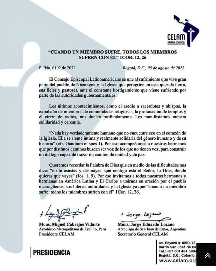 El Consejo Episcopal Latinoamericano se une al sufrimiento que vive gran parte del pueblo de Nicaragua y la Iglesia que peregrina en esta querida tierra, sus fieles y pastores, ante el constante hostigamiento que viene sufriendo por parte de las autoridades gubernamentales…