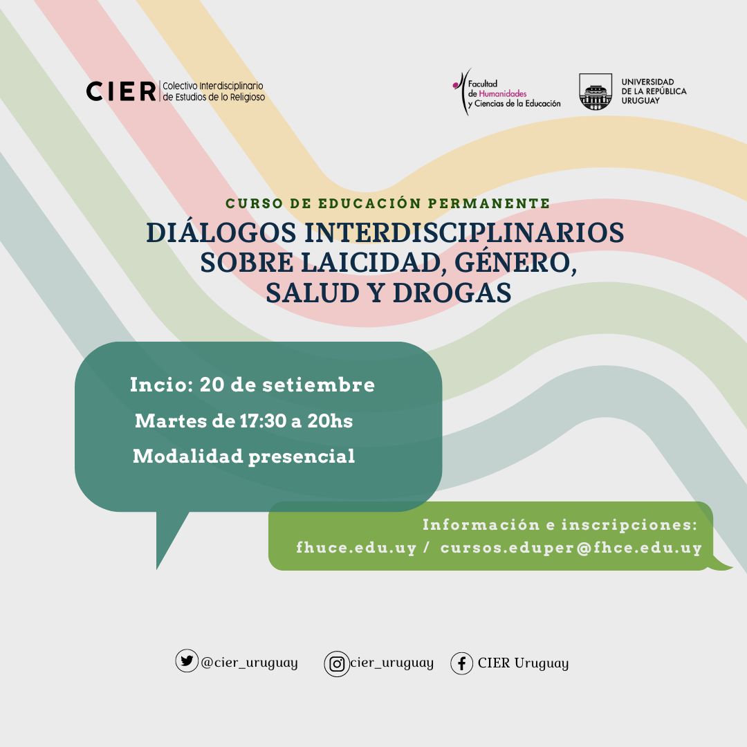 El Colectivo Interdisciplinario de Estudios de lo Religioso, perteneciente a la Facultad de Humanidades y Ciencias de la Educación de la Universidad de la República de Uruguay invita al curso de educación permanente: “Diálogos interdisciplinarios sobre laicidad, género, salud y drogas”…