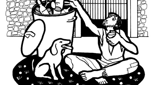 O texto diz que um homem rico, que se vestia com roupas finas e elegantes, púrpura e linho fino, fazia festas esplêndidas todos os dias. Havia um pobre, de nome Lázaro (que significa “Deus ajuda”), um mendigo cheio de feridas, estava no chão à porta do rico, estava faminto, desejava saciar sua fome com as sobras dos banquetes do rico, mas, nem isso conseguia, pois lhe faltavam forças; e os cachorros vinham lamber suas feridas.