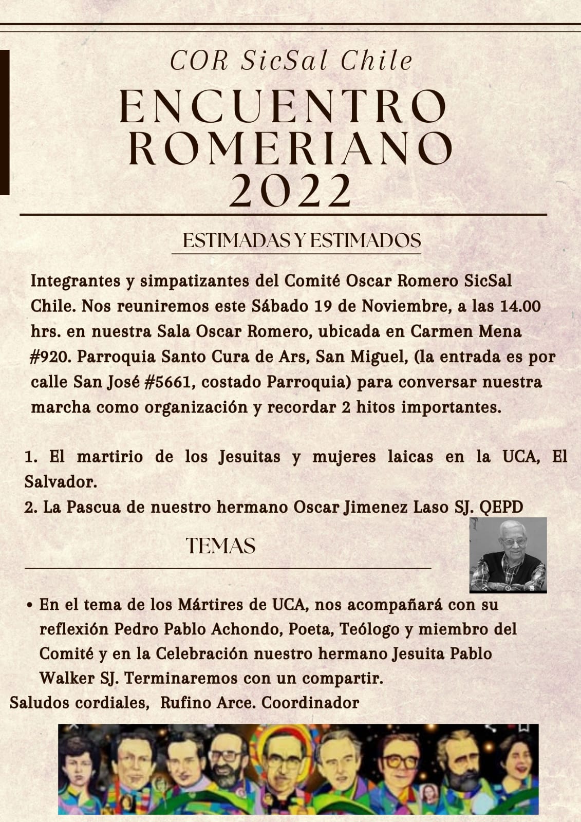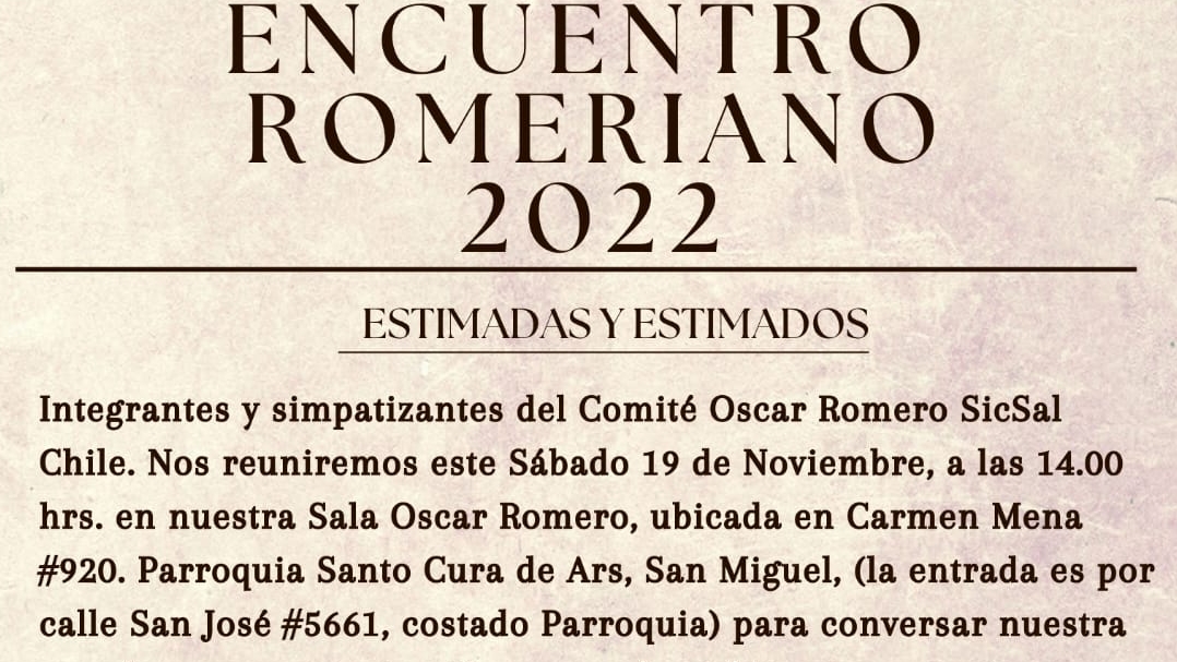 Integrantes y simpatizantes del Comité Óscar Romero SicSal se reunirán para conversar nuestra marcha como organización y recordar dos hitos importantes: el martirio de los jesuitas y mujeres laicas de la UCA, y la pascua de nuestro hermano Oscar Jiménez Laso…