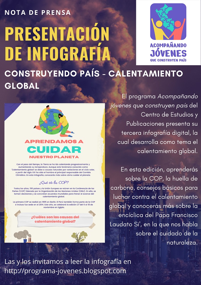 El programa Acompañando Jóvenes que construyen país del Centro de Estudios y Publicaciones presenta su tercera infografía digital, la cual desarrolla como tema el calentamiento global…
