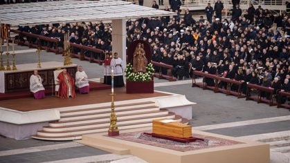 Escuché la lectura de los textos bíblicos y la posterior homilía leída por el Papa Francisco con mucho respeto. Las lecturas elegidas fueron un texto de Isaías, la primera Carta de Pedro y el evangelio de Lucas. Me pareció una buena elección. La homilía, breve, por cierto, lo cual es muy elogiable, fue un texto poético, estético, intimista y cargado de simbolismo, muy propio del género literario utilizado con frecuencia por Benedicto XVI. Rompía la formalidad de la ceremonia y nos introducía en un clima de recogimiento e interioridad. Me gustó que no fuera un panegírico del difunto, una glosa de sus méritos, una apología de vida. Solo al final Francisco citó a Benedicto y le llamó “fiel amigo del Esposo”, siguiendo con el simbolismo.