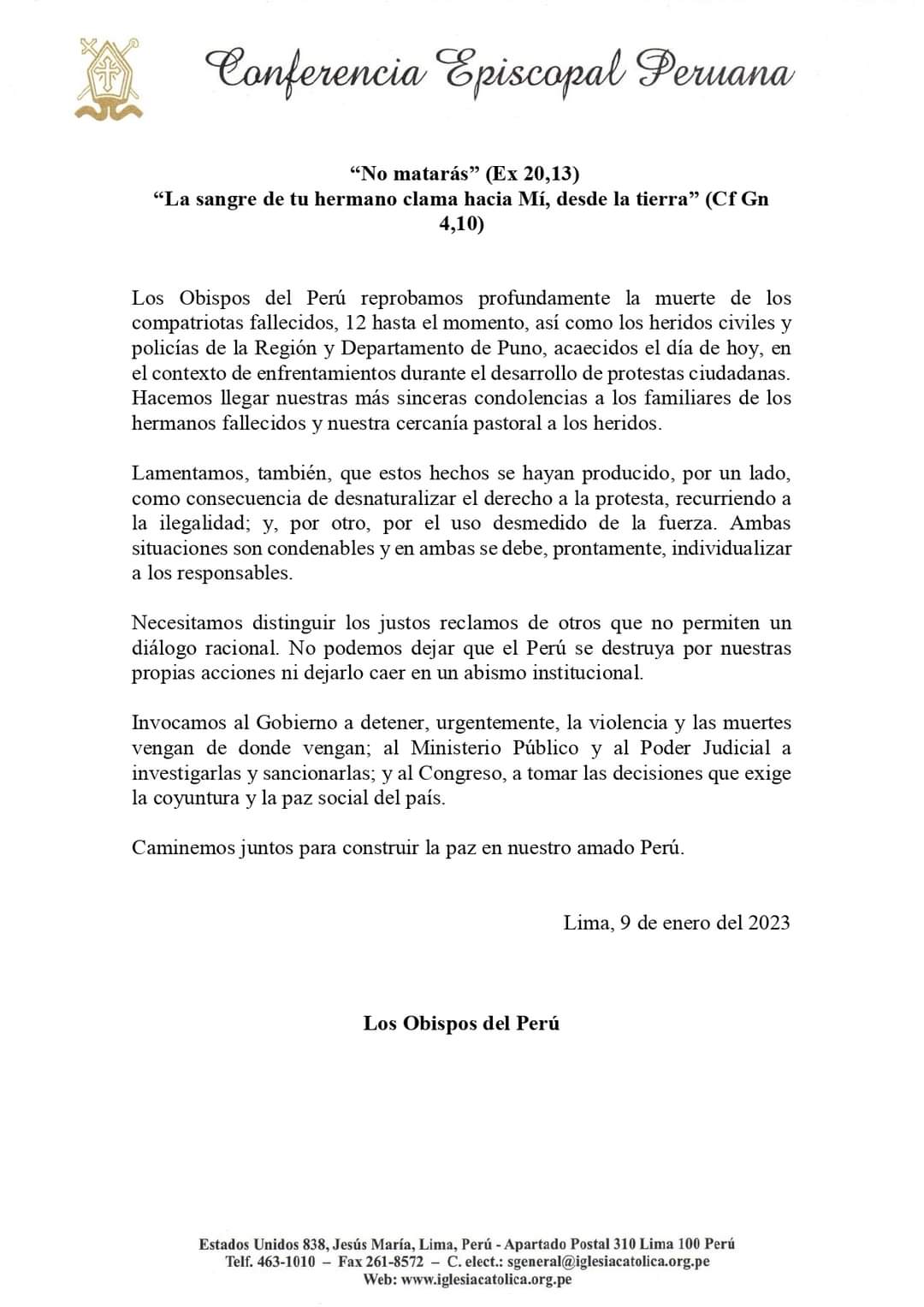 Los obispos del Perú reprobamos profundamente la muerte de los compatriotas fallecidos, 12 hasta el momento, así como los heridos civiles y policías de la región y departamento de Puno…