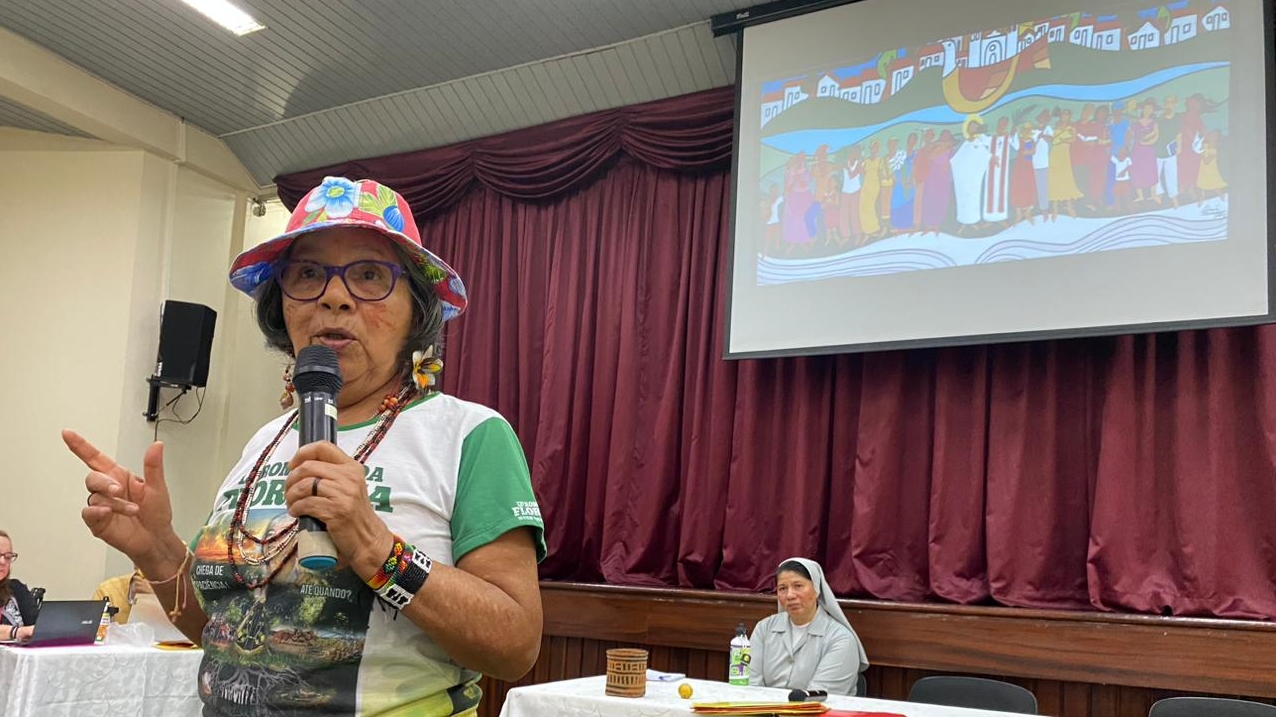 Se define, esencialmente, como indígena y misionera. Su intervención durante la primera jornada del Encuentro se orientó desde esa perspectiva. En su trayectoria ha vivido con comunidades pobres en el Nordeste brasileño, ha acompañado las luchas por la tierra en varios territorios, incluyendo la Amazonía, donde ha lidiado con los abusos de las empresas madereras, de quienes se adueñan de la tierra imponiendo el terror y de diversas formas de explotación.