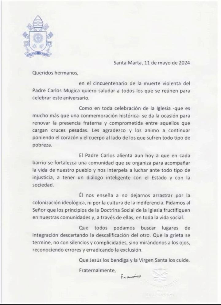 Queridos amigos, en el cincuentenario de la muerte violenta del Padre Carlos Mugica quiero saludar a todos los que se reúnen para celebrar este aniversario…