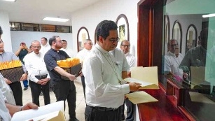 El arzobispo de San Salvador, José Luis Escobar Alas, junto con párrocos de otras iglesias y miembros de comunidades, llegaron a la Asamblea Legislativa, ubicada en el Centro de Gobierno, para entregar 150.000 firmas del pueblo que respaldan la petición de derogar la Ley de Minería Metálica en El Salvador.