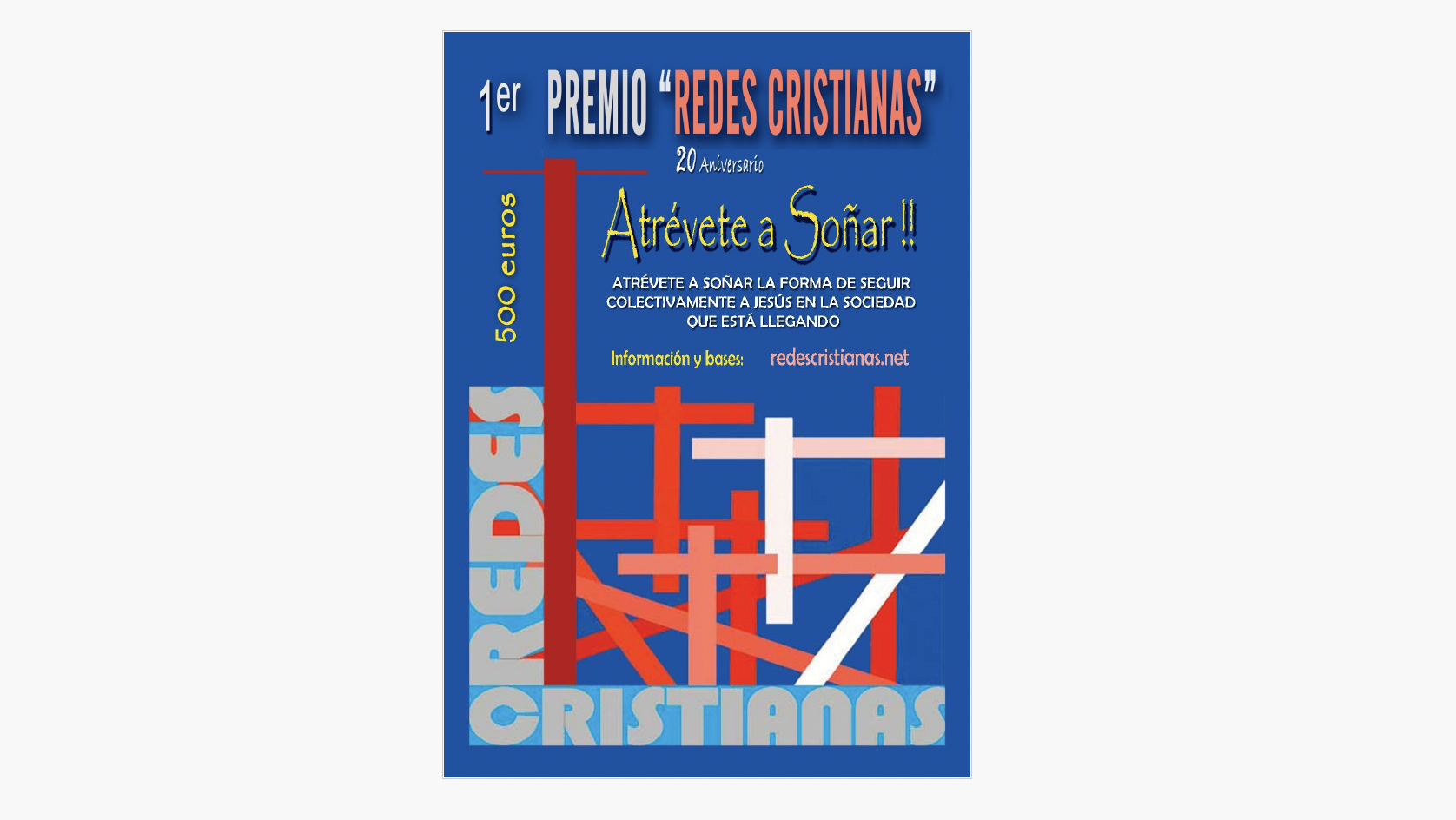 Redes Cristianas, convocante y patrocinador del I Premio “Atrévete a soñar”, es una asociación civil de inspiración religiosa, constituida por una Red de colectivos católicos presentes en todas las Comunidades Autónomas del Estado. En dicha red se articulan grupos, asociaciones, movimientos, comunidades, parroquias, congregaciones religiosas y otras organizaciones de similar orientación. Actualmente se estima en varios cientos los colectivos que, desde una posición crítica y propositiva, participan activamente en la defensa de la igualdad, la verdad y la justicia, —en un contexto democrático— frente al colonialismo neoconservador, el patriarcalismo y el negacionismo que azota el panorama sociopolítico y religioso…
