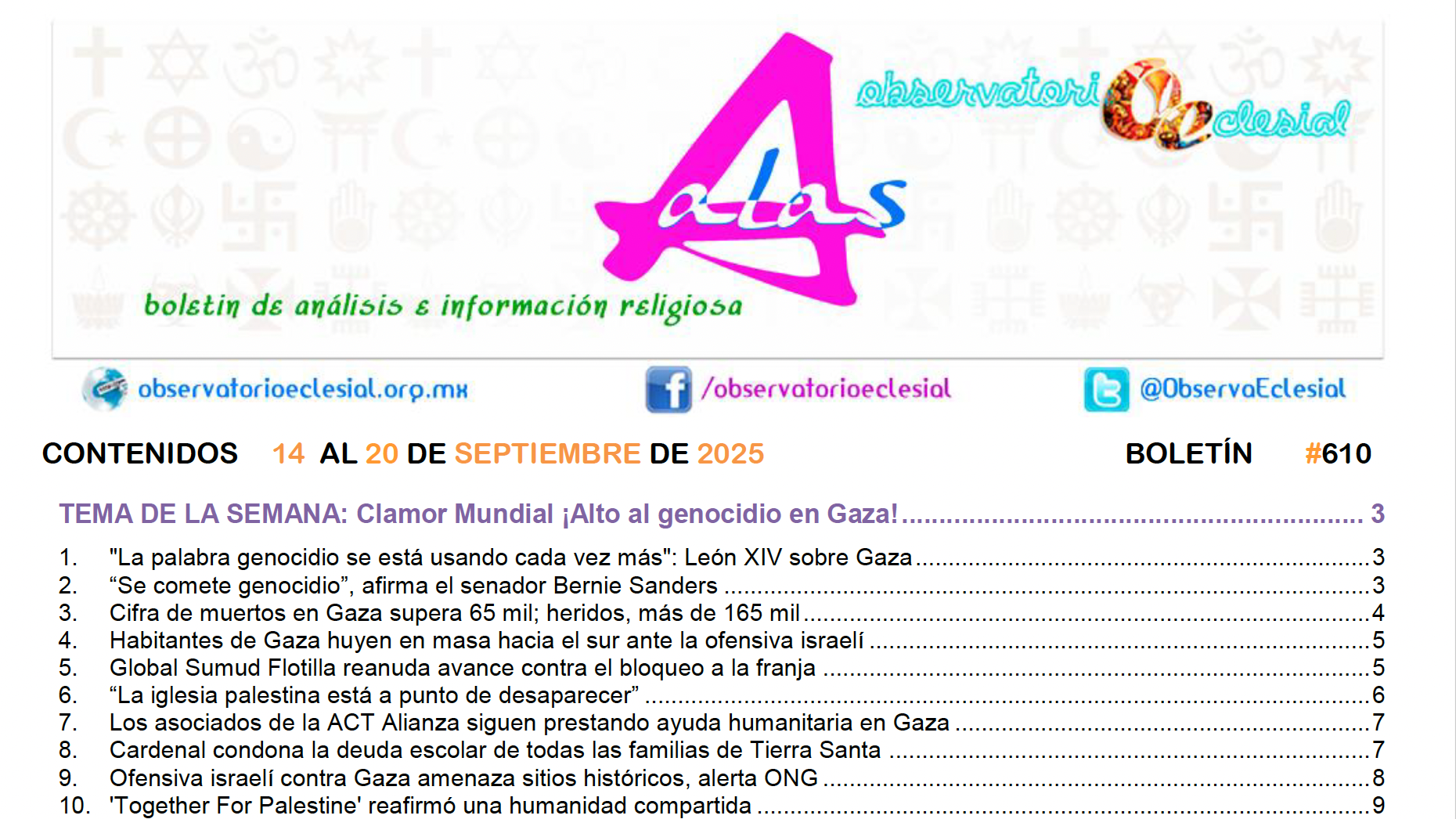 El Boletín de Análisis e Información Religiosa – ALAS, dedica su edición No. 610 al clamor mundial frente al genocidio de Gaza, como tema de la semana, además de otras informaciones del ámbito político, social, eclesial, internacional, género y ecumenismo y varios documentos.