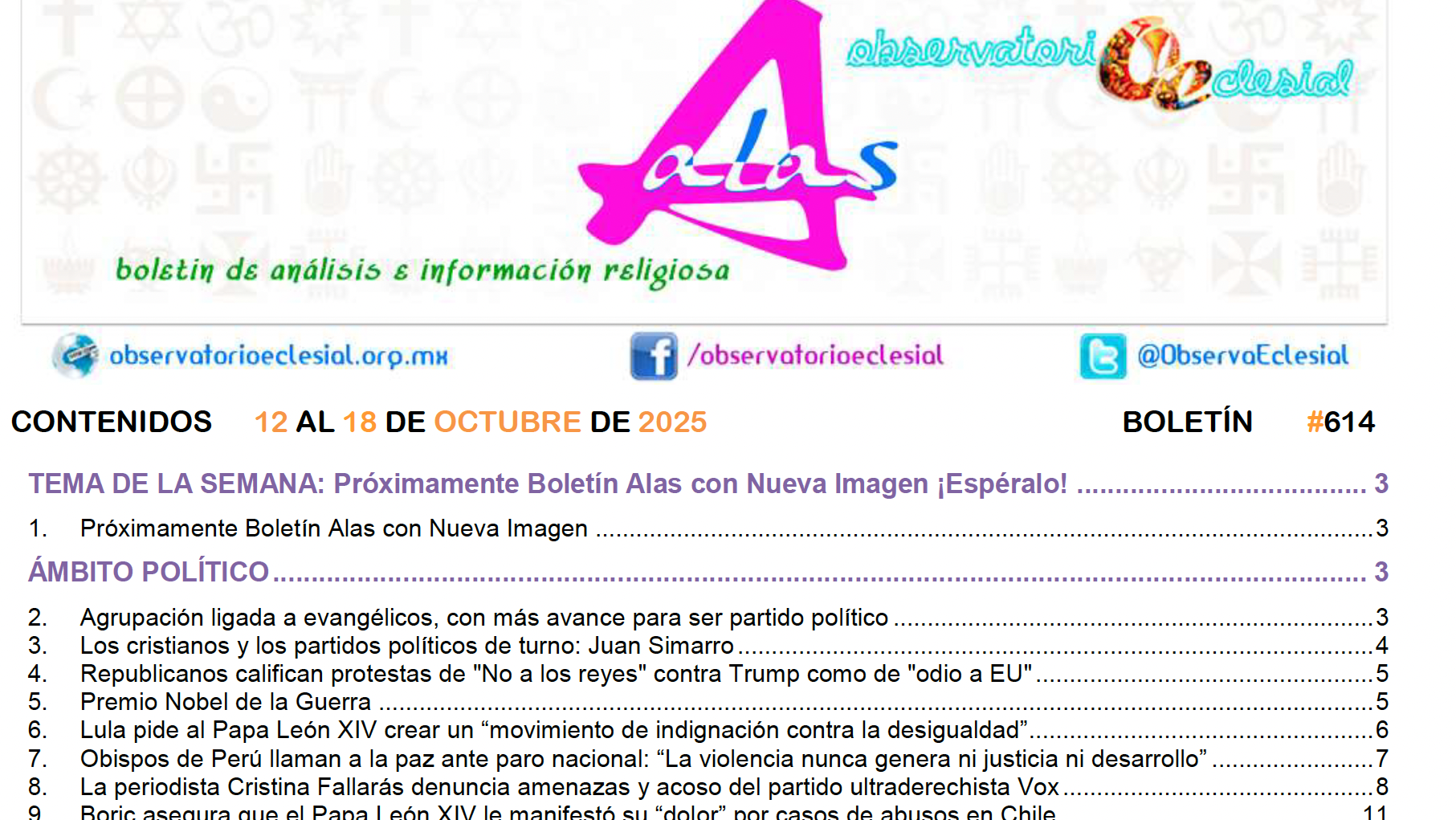 Como señalamos en el número anterior del Boletín Alas, esta publicación cumplió 24 años de vida en este mes de octubre del 2025. De manera ininterrumpida (a excepción de un breve periodo en marzo del 2021) ha seguido difundiéndose en línea a nuestros suscriptores y reproducido en las páginas de Facebook del Observatorio Eclesial e Iglesias por la Paz, alcanzando a miles de lectores.