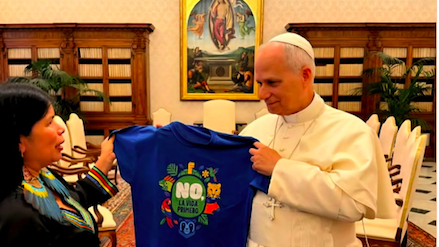 Patricia Gualinga, indígena originaria de Riobamba, es defensora los derechos humanos y ambientales, tuvo un encuentro con el papa León 14 en días recientes. En esta ocasión regaló al papa León una camiseta cuyo dibujo estampado resalta el ‘NO’ acompañado de la expresión ‘La vida primero’, rodeado de imágenes de plantas y animales…