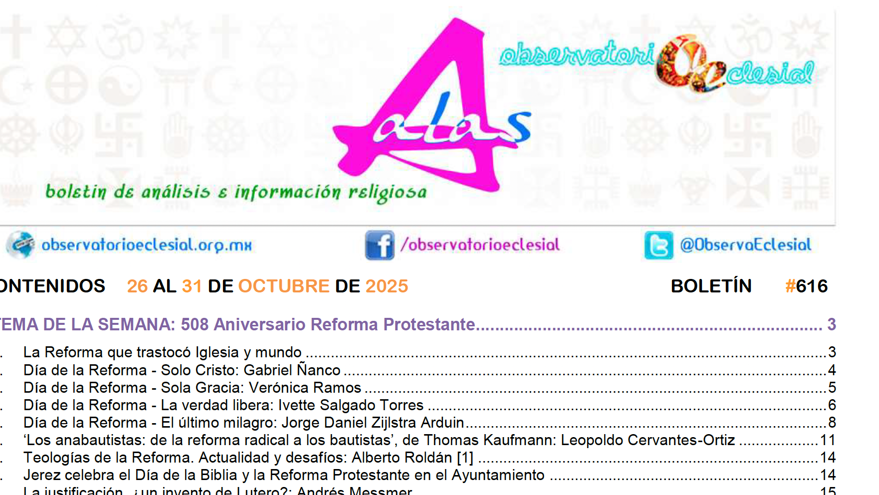 La edición 616 del Boletín de Análisis de Información Religiosa (ALAS), dedica el tema de la semana al “508 aniversario de la reforma protestante”. También presenta artículos y materiales del ámbito político, social, eclesial, internacional, género y ecumenismo y documentos.