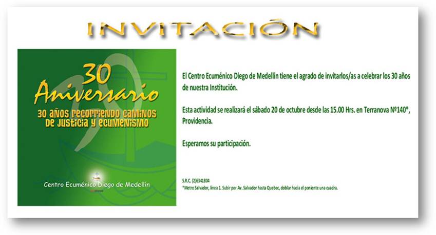 El Centro Ecuménico Diego de Medellín tiene el agrado de invtiralos/as a celebrar los 30 años de nuestra insitución.