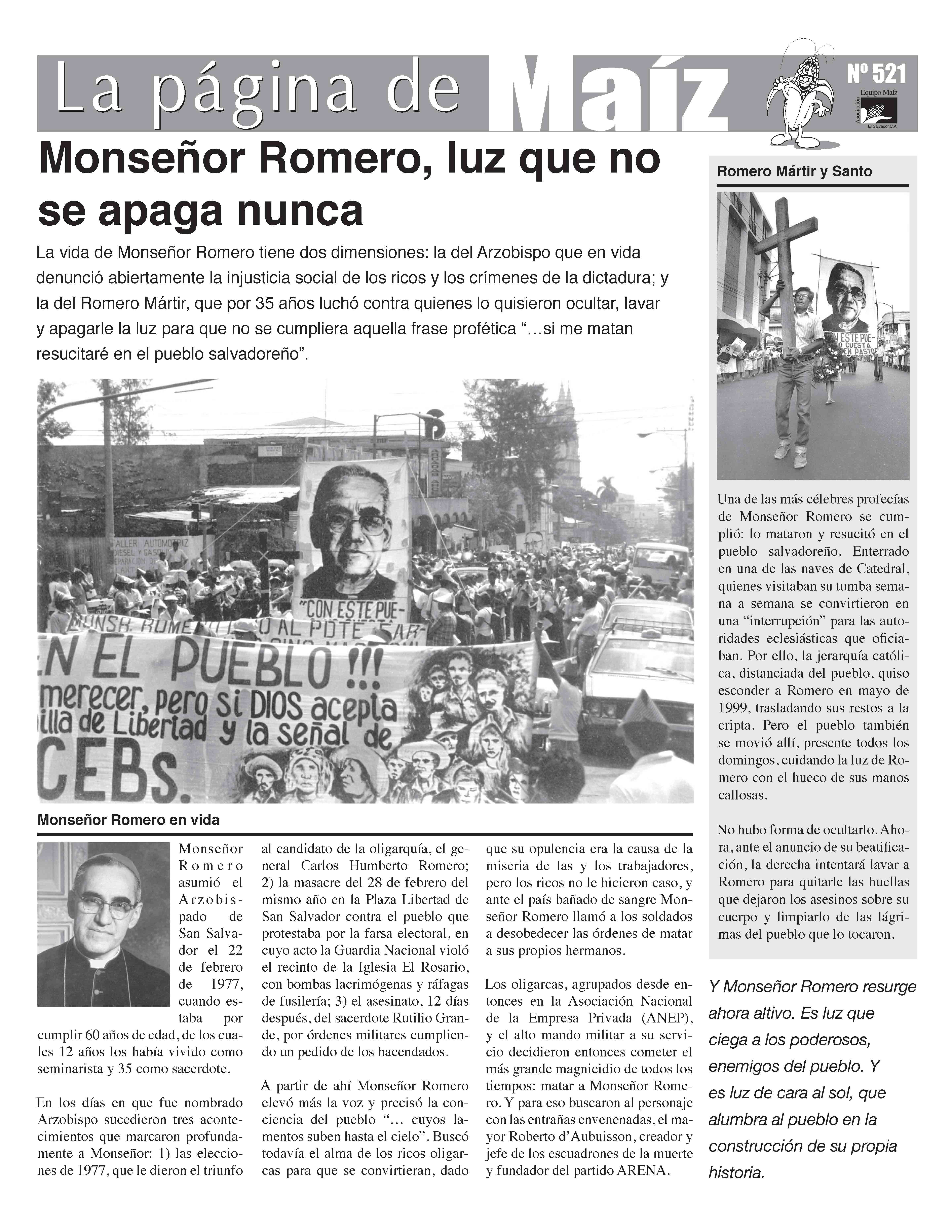 “La vida de Monseñor Romero tiene dos dimensiones: la de Arzobispo que en vida denunció abiertamente la injusticia social de los ricos y los crímenes de la dictadura; y la del Romero Mártir, que por 35 años luchó contra quienes quisieron ocultar, lavar y apagarle la luz para que no se cumpliera aquella frase profética: ‘… si me matan resucitaré en el pueblo salvadoreño’ (...)”.