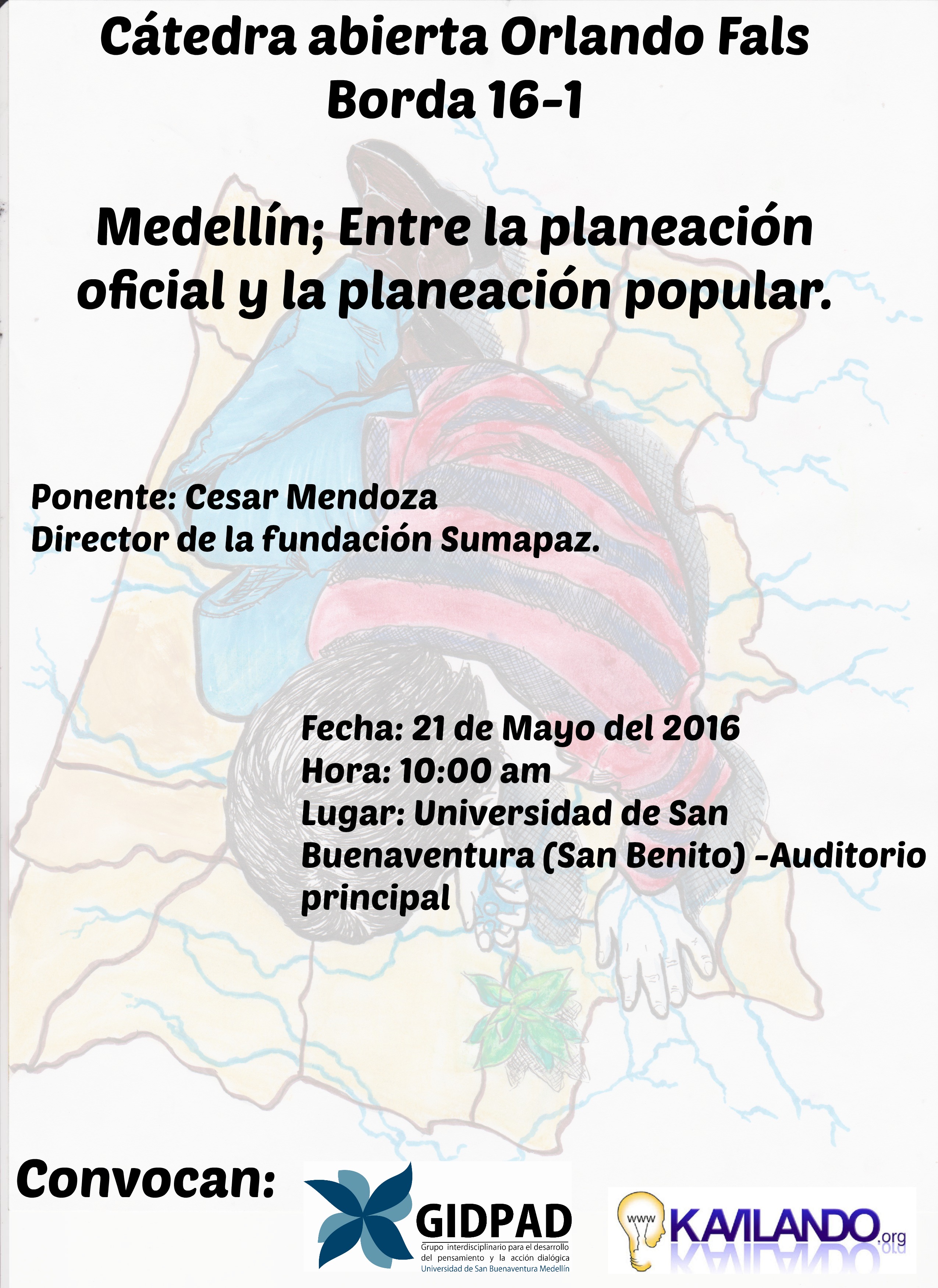 GIDPAD y KAVILANDO.org invitan a la cátedra Orlando Fals Borda, con la participación de César Mendoza, director de la fundación Sumapaz, como ponente que desarrollará la temática: “Medellín: entre la planeación oficial y la planeación popular”. La conferencia tendrá lugar el 21 de mayo de 2016 a las 10 a.m. en la Universidad San Buenaventura.