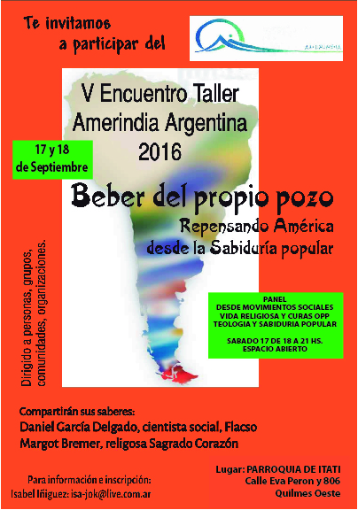 Amerindia Argentina invita a participar en el V Encuentro Taller 2016, dirigido a personas, grupos, comunidades y organizaciones. Tema: Beber del propio pozo, repensando América desde la sabiduría popular. Compartirán sus saberes Daniel García Delgado y Margot Bremer. Fecha: 17 y 18 de septiembre.