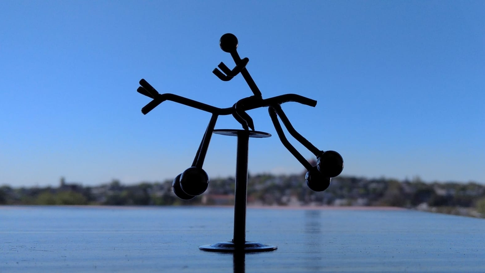 Este móvil de la foto, ese caballito que se hamaca –con un fondo gris de lluvia- y cuyo jinete tan confiado va con las manos libres, me lo regaló un amigo hace más de veinte años; un extraño regalo para una mujer adulta. Cuando pregunté por el significado del regalo, me respondió: “significa que la vida es movimiento, no permanezcas inmóvil, confía, juega, danza, otros te sostienen, y Otro”. Muchas generaciones de niños han jugado con el móvil, creo que preguntándose por qué no se los regalaba. Ya no hay por aquí niños que toquen con la punta de un dedito el caballito, así que de vez en cuando lo muevo yo y contemplo hasta que se detiene y vuelvo a darle movimiento, agradecida… Me evoca la libertad paradójica y su hermoso riesgo que se sostiene en un punto casi imperceptible para desplegarse, me anima a invitar a otros a soltar seguridades materiales y confiar audazmente en tesoros sutiles.